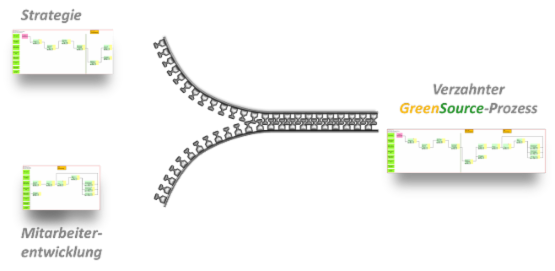 Der Ansatz von GreenSource betrachtet das Unternehmen ganzheitlich. Hierbei werden relevante Unternehmensprozesse – hinsichtlich Strategie und Mitarbeiterentwicklung - auf effektive und effiziente Weise verzahnt.